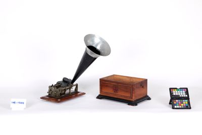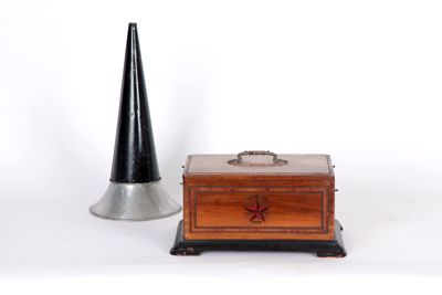 Fonografo Pathé per la riproduzione di cilindri in cera di grandi dimensioni, costituito da una cassetta in legno con base profilata e un coperchio con maniglia per il trasporto.