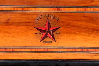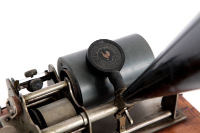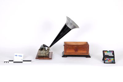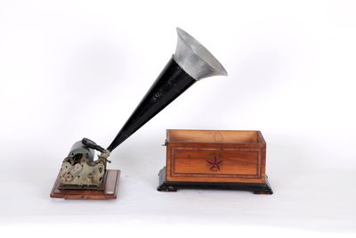 Sul lato destro della cassetta vi è la chiave per l'avvolgimento della molla di caricamento, la quale aziona il meccanismo che fa ruotare il cilindro e avvia la riproduzione. Il pannello metallico su cui è montato l'intero meccanismo di riproduzione è fissato sulla parte superiore della cassetta. Su questo pannello sono presenti anche la vite per la regolazione della velocità di riproduzione e il braccio che regge la tromba a imbuto in metallo nichelato, la quale di inserisce sopra la testina di riproduzione.