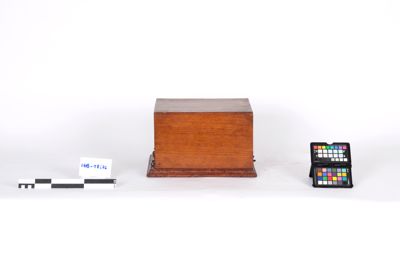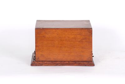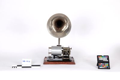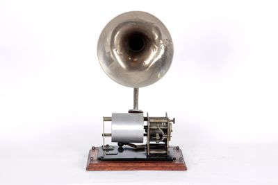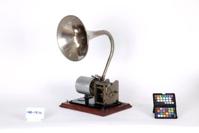 Fonografo Pathé modello Idéal, per la riproduzione di cilindri in cera di grandi dimensioni. Il fonografo è montato su una base in legno di forma rettangolare, con coperchio.