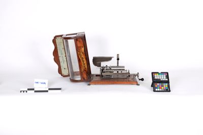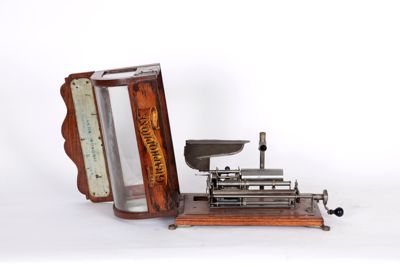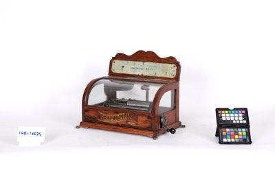 Il fonografo è protetto da un vetro con cornice in legno. Il vetro può essere incernierato per consentire l'accesso al meccanismo del fonografo per la sostituzione dei cilindri di cera. Sul pannello superiore del vetro è presente la fessura in metallo per l'inserimento della moneta o del gettone. Accanto ad esso si trova l'alloggiamento per la tromba, mancante.