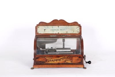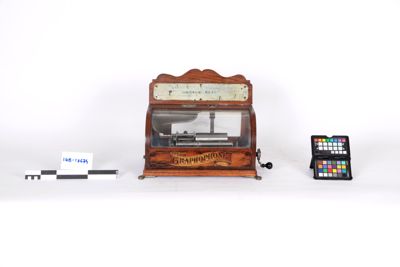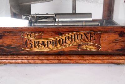 La macchina è montata sul pannello superiore di una cassa rettangolare in legno, che poggia su piedini metallici sporgenti. Sul lato anteriore si trova l'immagine di un nastro dorato con all'interno la scritta "The Graphophone" e i brevetti.