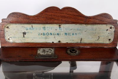 Una cornice in legno di forma ornamentale è fissata sopra il pannello posteriore e reca il nome del rivenditore italiano e le istruzioni per l'avvio della macchina, solo parzialmente leggibili.