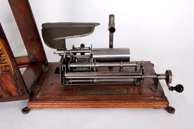 Il meccanismo del fonografo è montato su una una piastra d'acciaio, sulla quale è applicata una targhetta che indica il modello del fonografo, i brevetti, il numero di serie e la ditta produttrice.