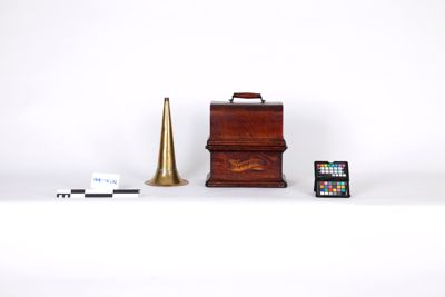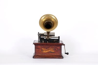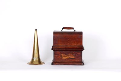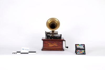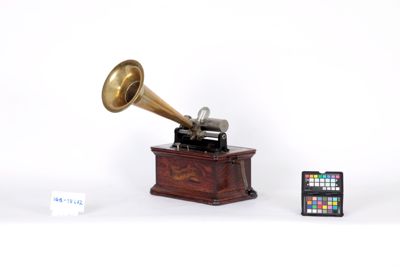 Fonografo Columbia modello AZ per la riproduzione di cilindri in cera, costituito da una cassetta in legno con base profilata e un coperchio dotato di maniglia per il trasporto. Sulla parte frontale della base è rappresentato un nastro dorato, con all'interno la scritta "The Graphophone" e i brevetti. Ai lati della cassetta sono presenti le serrature per la chiusura del coperchio.