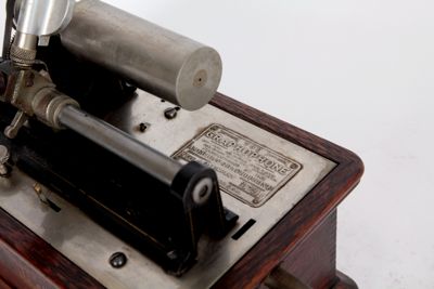 La targa con il nome del modello, le date dei brevetti e il marchio del produttore si trova sul pannello superiore, dietro il cilindro, mentre sulla parte frontale, dipinta di colore nero e con decorazioni floreali, si intravede la scritta "Graphophone", quasi del tutto cancellata. Sulla parte frontale sono anche presenti la leva di avviamento del motore e la vite per la regolazione della velocità di riproduzione.