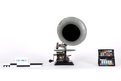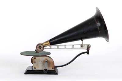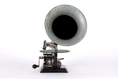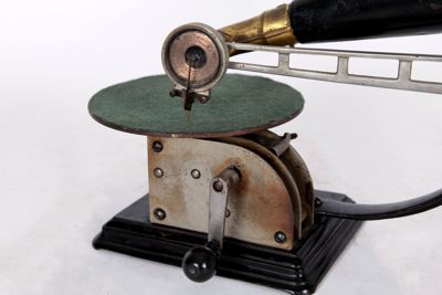 Sopra il corpo in metallo poggia il supporto per il disco, ricoperto con un panno verde. Sulla sinistra dell'apparecchio è presente l'alloggiamento per la manovella che carica il motore a molla e fa girare il giradischi.