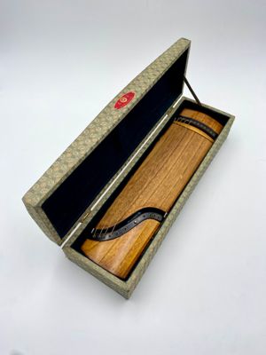 Conservato dentro la sua custodia rivestita esternamente in stoffa, lo strumento presenta una tipologia e una fattura riconducibile a un esemplare di piccole dimensioni confezionato per un mercato di tipo turistico. La tavola armonica è in bambù e alle estremità sono presenti due ponticelli fissi; quello superiore ha una forma ondulata per permettere alle corde di avere una lunghezza differente. Delle nove corde realizzate con cordicelle ne sono presenti solo quattro. Nella parte verso i bassi è presente un cassettino in cui si potevano riporre sia gli 11 ponticelli mobili che i plettri. Sul fronte e sul retro dello strumento (sui bordi) è applicata a rilievo una tipica decorazione a dragoni stilizzati. Lo strumento è conservato nella sua custodia a cassetta rivestita all'esterno di stoffa decorata con motivi geometrici sui toni del verde, rosso, oro. Sul fronte della cassetta è presente un'etichetta metallica con scritte cinesi che probabilmente di riferisce alla ditta di produzione.