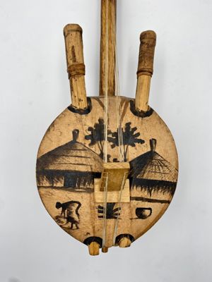 Lo strumento ha una fattura un po' rozza e per le sue dimensioni è da considerarsi come un oggetto più di tipo turistico. Sulla pelle è presente un disegno a inchiostro che riproduce un tipico villaggio africano con una donna intenta a sollevare una cesta