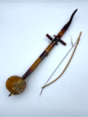Lo strumento ad arco, di ambito culturale egiziano, è costituito da una noce di cocco traforato con 3 fori distanziati intorno al corpo più uno alla base. Il manico in legno squadrato a coltello termina con un corno animale incollato; il manico è fissato alla noce per il tramite di una punta di metallo che la trapassa per poi fungere da punto di legatura della cordicella alla quale sono legate le corde. Il ponticello è costituito da un piccolo pezzo di bambù. Sono presenti due corde formate da crini di cavallo assicurate poi per il tramite di una cordicella ai due piroli laterali anche questi sbozzati a coltello. E' presente anche l'archetto realizzato in legno sbozzato con crini di cavallo. Lunghezza archetto: 420 mm.