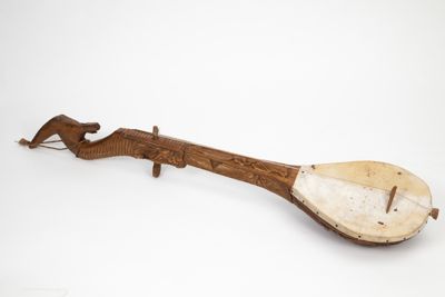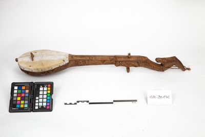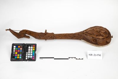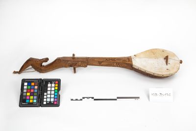 Lo strumento è costruito in un unico blocco di legno, scavato nella parte più larga che forma la cassa armonica che è chiusa da una pelle fissata con chiodini a mo' di tavola armonica. Un pirolo sagittale è inserito posteriormente nella parte alta del manico che termina con un cavigliere scolpito a forma di testa animale di tipo equino. La corda armonica è una ed è realizzata in nylon; passa attraverso un foro nella parte alta del ponticello che ha una forma triangolare. La parte posteriore della cassa  scolpita, come tradizione, a rilievo e con motivi floreali in questo caso in maniera incisiva e un po' grossolana. La tastiera è anch'essa arricchita da una decorazione scolpita di tipo floreale. Insieme allo strumento si conserva il suo archetto, di foggia tradizionale, che ha una lunghezza di 475 mm.