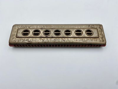Armonica a bocca, modello Alpina CG, - dotata di 30 fori di soffiaggio disposti su due file. Il corpo risuonatore dello strumento è in legno