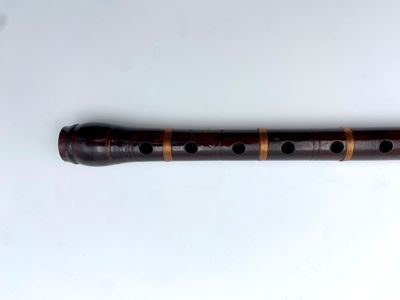 L'estremità superiore dell'imboccatura è chiusa quasi del tutto da un tappo, il fiato passa solo da una piccola fessura per infrangersi poi sulla lama della finestrella. Ha sei fori per le dita anteriori e uno posteriore. La parte terminale del tubo ha una forma leggermente rigonfia. Fili di metallo (probabilmente rame) formano delle decorazioni a cerchio in sei punti; si vede anche la saldatura dei fili. Sullo strumento sono presenti altre scannellature di decorazione.