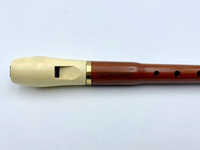 Flauto in due parti costituito dal becco in plastica bianca su un corpo di legno. Una ghiera di metallo dorato divide le due parti. La cameratura del flauto è di andamento conico e conico inverso nella parte terminale.