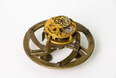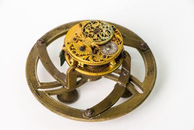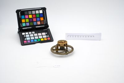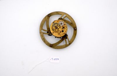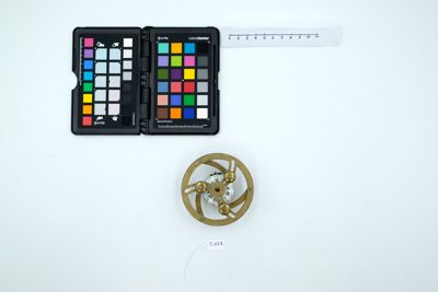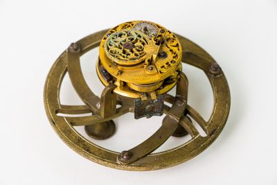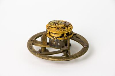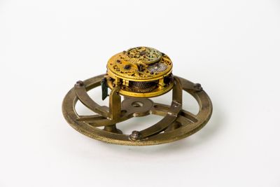 Supporto metallico che regge l'orologio. L'orologio (vedi IGB-6521) รจ costituito da quadrante metallico e smaltato di bianco con minuti indicati sia in numeri romani sia in numeri arabi. Cassa cilindrica in metallo dorato decorata sul retro con motivi floreali e presenta iscrizione "Jacques Mauris". Ingranaggi e movimenti in metallo dorato a vista.