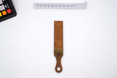 Misuratore in legno con valori incisi. Presente doppio foro e barra metallica.