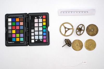 Due ruote dentellate una a 3 raggi e una a 5, entrambe con foro centrale. Due ruote piene con foro centrale e una ruota piena con foro centrale e dentellatura. Un elemento composto da due ruote montate su pignone. Gli elementi hanno dimensioni diverse.