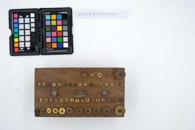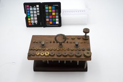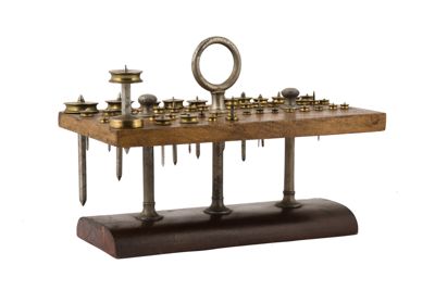 Oggetto composto da un supporto ligneo con tre perni in metallo contenente 50 alberi di dimensioni variabili