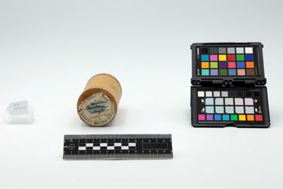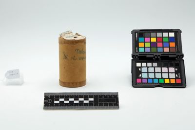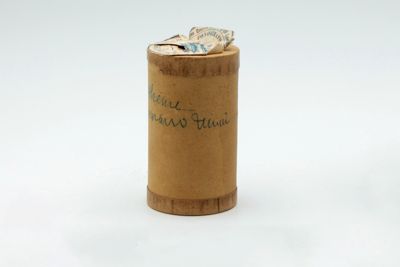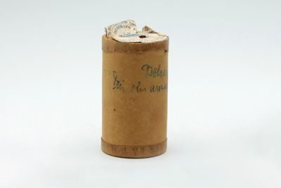 Cilindro incerato per fonografo in custodia originale, conservato in una scatola in legno e cartone per spedizioni postali (vedi IGB-17300).