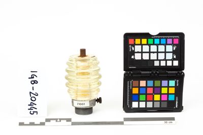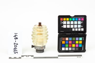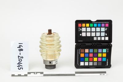 Elemento isolatore in vetro, probabilmente di apparecchi radiotrasmittenti.