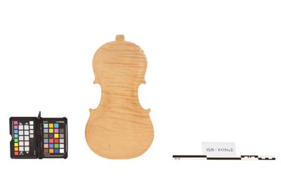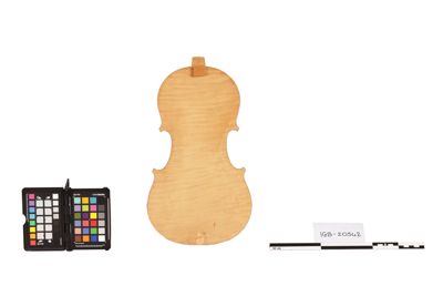 Tavola in acero del fondo in un solo pezzo di un violino con bombatura interna ed esterna finita ma senza filettatura. Sul retro, in prossimità della nocetta, è fissato un blocchetto di legno che serviva per poterla appendere all'interno della vetrina didattica.