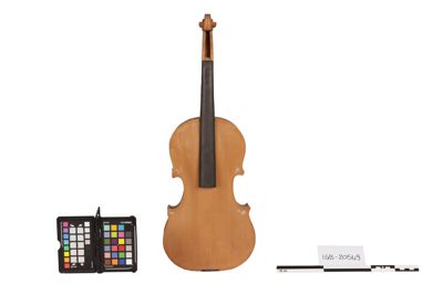 Strumento allo stato grezzo con cassa chiusa ma senza lavorazione dei filetti e senza intaglio delle effe. Il manico manca dei fori per i piroli. E' presente la tastiera, il capotasto superiore con il segno per l'alloggiamento delle corde, il capotasto inferiore; manca il bottone. La tavola armonica è un semilavorato che sembra non essere pertinente con il resto. Lo strumento non è verniciato. Il violino faceva parte del gruppo di 4 strumenti definiti nell'inventario del 2016 "in lavorazione" e contrassegnati dal numero di inventario IGB-5656. Al momento sono stati riconosciuti altri due strumenti del gruppo contrassegnati dal numero IGB-5656-1 (una viola senza tastiera) e IGB-5656-2 (un violino con tastiera).