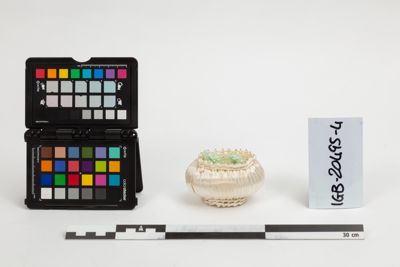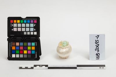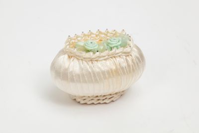 Porta sapone parte di un set accessori da bagno composto da: porta sapone decorato, rasoio, spazzolino con supporto e bottiglia in ceramica.