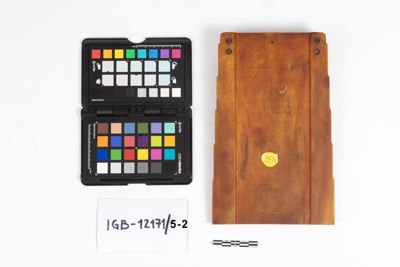 Set composto da 8 pezzi: due porta-calamaio, due porta-penne (uno singolo e uno doppio), un porta-blocco (o porta diario), un porta-rubrica telefonico a molla, un tampone assorbi inchiostro, un ferma-fogli.