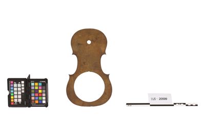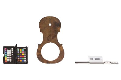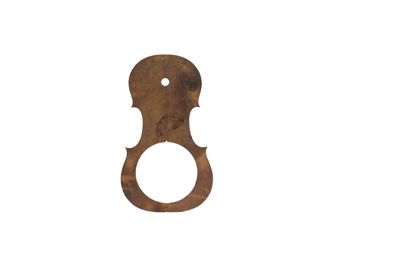 Dima in metallo del profilo interno (le punte sono a punta) della cassa armonica di violino. Presenta, in maniera desueta, due fori uno nella parte superiore e uno decisamente grande nella parte inferiore.