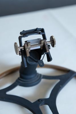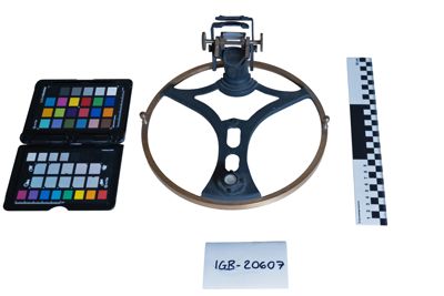 Lo strumento strumento nautico in ottone (?) presenta un cerchio con bordo a ghiera e due pomelli per il posizionamento su una bussola; da un alto del cerchio, si eleva un ampio mirino taccato a prisma con due filtri semicircolari e una vite zigrinata per la movimentazione del prisma. Di fronte al mirino, sotto il prisma, รจ posizionata una livella a bolla. Numero di serie 171520
