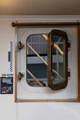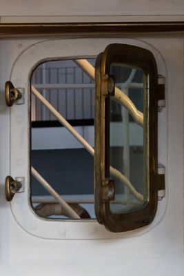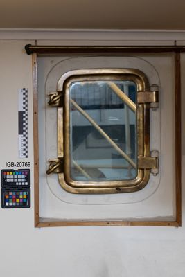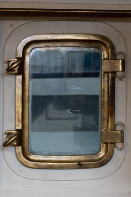 Finestra e portellino di luce rettangolari, in bronzo, sulla parete a dritta della sala nautica del TS Conte Biancamano