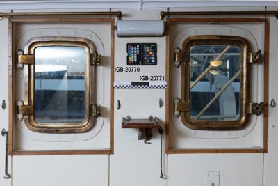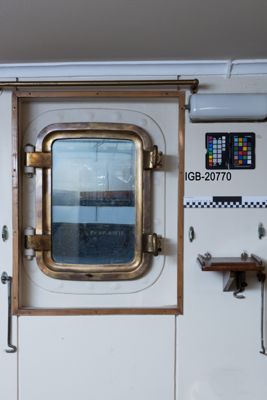Finestra e portellino di luce rettangolari, in bronzo, sulla parete a sinistra della sala nautica del TS Conte Biancamano
