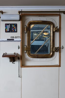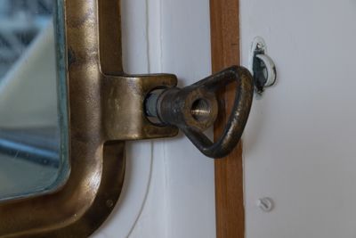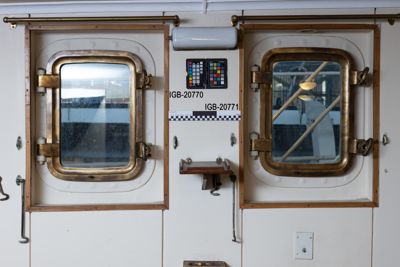 Finestra e portellino di luce rettangolari, in bronzo, sulla parete a sinistra della sala nautica del TS Conte Biancamano