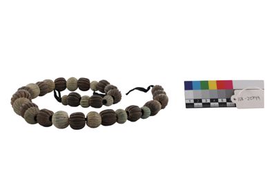 Collana con perle di terracotta a sequenza ordinata di grani sferici striati (forma di melone) grigio-scuro e grigio-azzurro