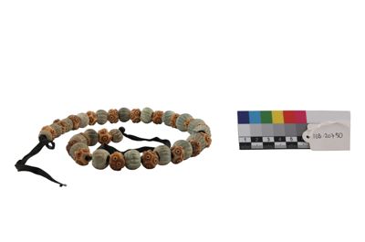 Collana con perle di terracotta a sequenza ordinata di grani sferici striati (forma di melone) grigio-azzurro e poligonali in avorio lavorato