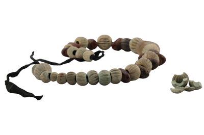 Collana con perle di terracotta, ambra e cristallo di rocca