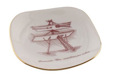 Posacenere Ginori Alitalia, con bordo dorato, realizzata per le celebrazioni leonardesche del 1952. Sono presenti l'iscrizione "Leonardo - Una macchina per volare" e il disegno di una macchina leonardesca