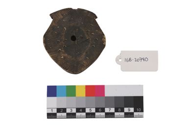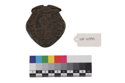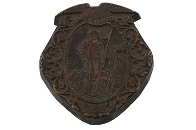 Stampo con figura maschile, ancora e attrezzi marinari, parti di natanti e l'iscrizione (al contrario): INDUSTRIE NAZ