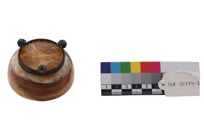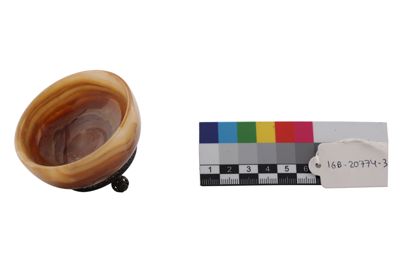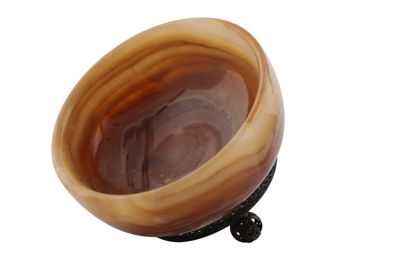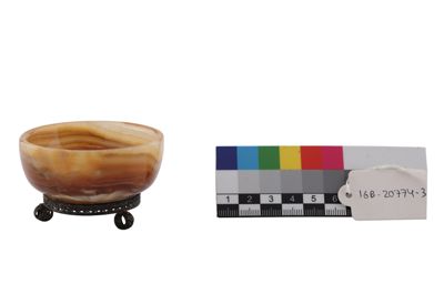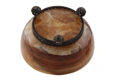 Coppa in onice di piccole dimensioni con 3 piedini tondi uniti da un cerchio in metallo posto sul fondo per l'appoggio. Ciascun piedino è costituito da due fasce tonde metalliche, traforate e decorate, incrociate perpendicolarmente l'una nell'altra.