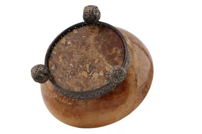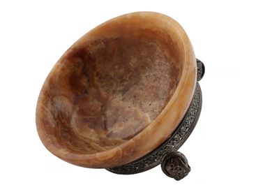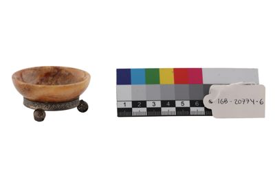 Coppa in onice di piccole dimensioni con 3 piedini tondi uniti da un cerchio in metallo posto sul fondo per l'appoggio. Ciascun piedino è costituito da due fasce tonde metalliche, traforate e decorate, incrociate perpendicolarmente l'una nell'altra.