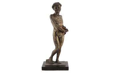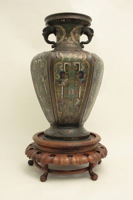 Vaso in bronzo a smalti champlevé a pianta esagonale, con piede strombato, spalla alta, collo strombato e bocca a parete verticale con labbro everso. Sul collo si trovano due manici a protromi zoomorfe arcaicizzanti stilizzate. Decorazione con smalti verde, rosso, bianco, blu e blu scuro, a fitti disegni geometrici e fitomorfi.