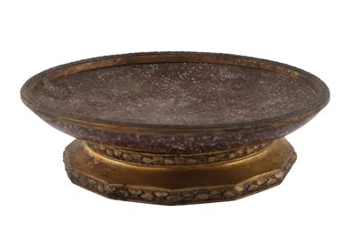 Il manufatto si presenta come una coppa in porfido montata su un supporto circolare in bronzo dorato.