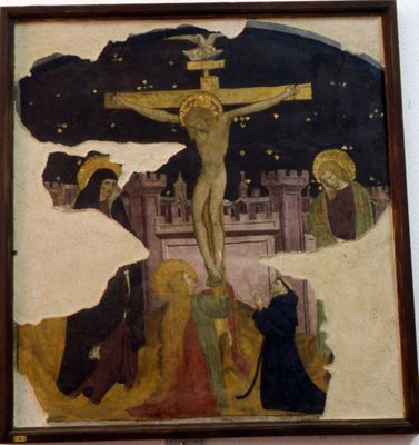 Dipinto a olio su tela raffigurante la Madonna col Bambino in trono e i santi Pietro, Francesco, Antonio da Padova e Paolo, con un angelo musicante. In deposito dalla Pinacoteca di Brera.